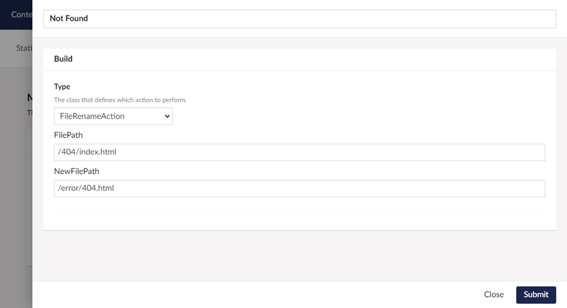 A new feature added in the v2 release are 'Actions'. These are components that can be configured to run some extra processing once the site generation has completed. Built into the core package are actions for renaming, copying, or deleting files; the Netlify package has a specific action for creating the 404 page.